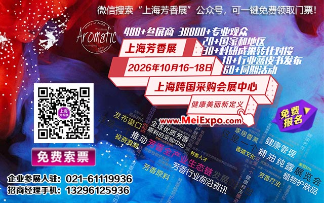 展會(huì)門票:在線免費(fèi)領(lǐng)取,憑短信+刷身份證快速入場(chǎng)。微信搜索【芳香展】服務(wù)號(hào),關(guān)注領(lǐng)取免費(fèi)門票,可持續(xù)關(guān)注后續(xù)展會(huì)活動(dòng)。